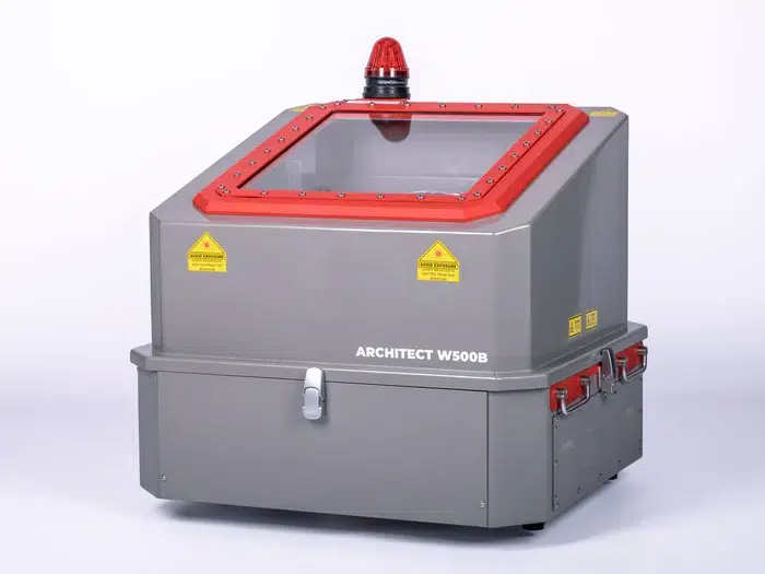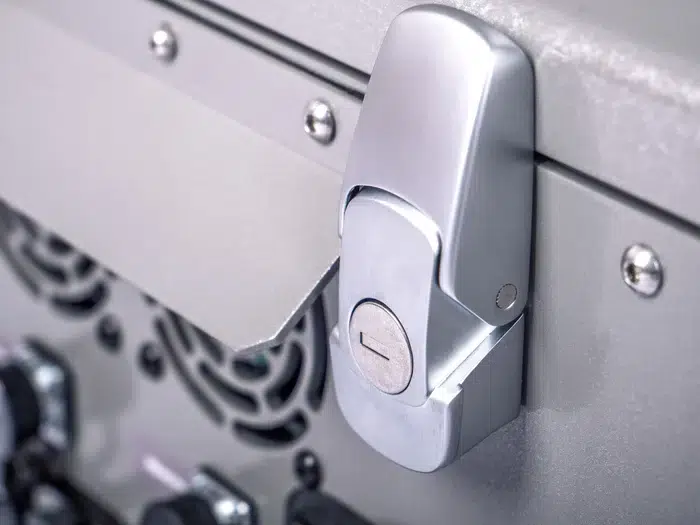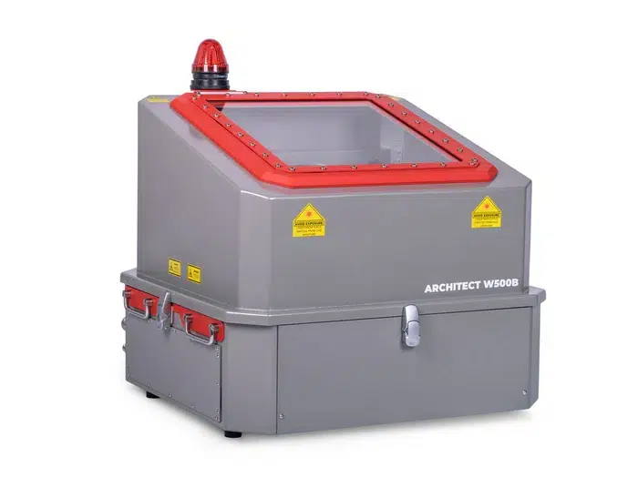 Emission warning beacon, emission delay, magnetic interlock, electronic shutter, Emergency STOP system with keyed remote and manual RESTART button.