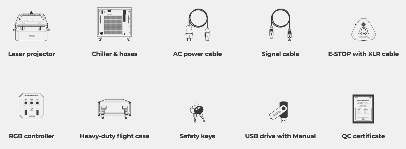 Chiller, 10M Water supply hoses, 2x Heavy-duty flight case, 10M AC power cable, 10M Control signal cable, 0-5 Volt RGB controller, E-STOP Remote with 10M 3-pin XLR cable, Set of 2 safety keys, USB memory stick with the user manual, QC certificate.