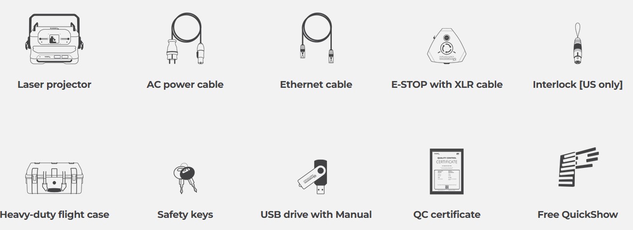 Heavy-duty flight case, 1.5M AC power cable, 25M Ethernet rj45 signal cable, E-STOP Remote with 25M 3-pin XLR cable, Set of 4 safety keys, Interlock bypass dongle [supplied for the USA only], USB memory stick with the user manual, QC certificate.