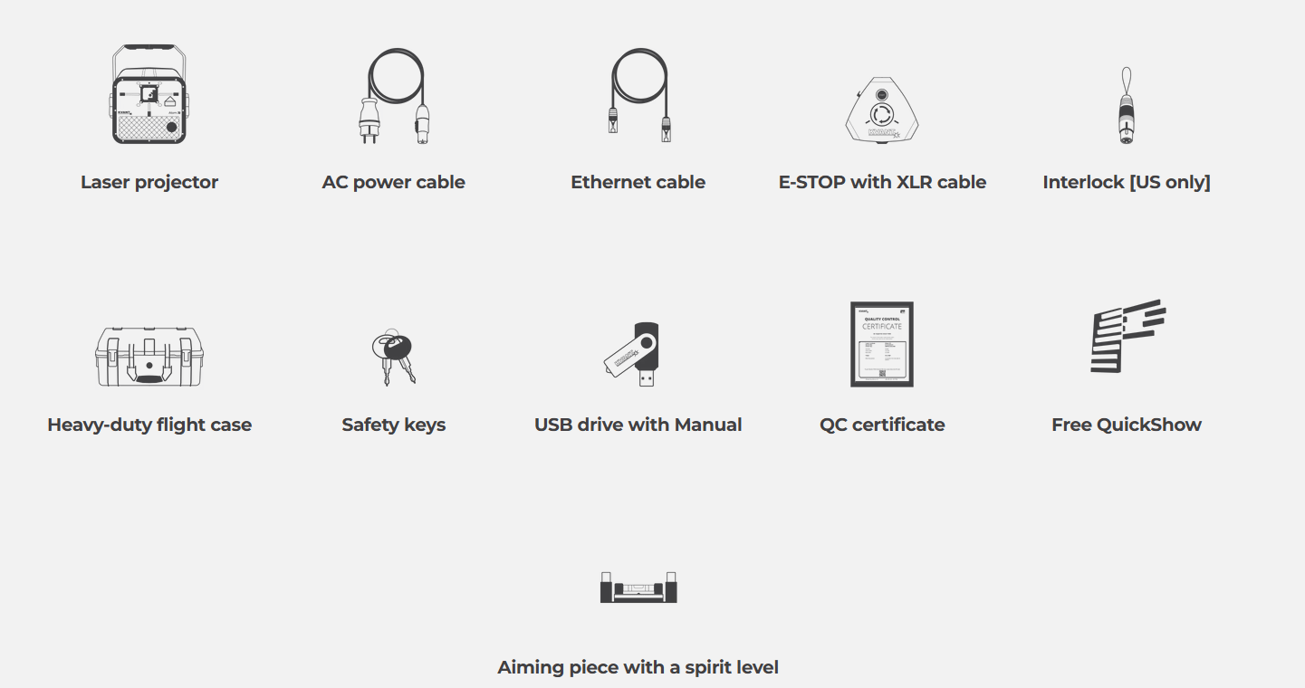 Heavy-duty flight case, IP65 1.5M AC power cable, IP65 10M Ethernet rj45 signal cable, E-STOP Remote with IP65 10M 3-pin XLR cable, Set of 4 safety keys, Interlock bypass dongle [supplied for the USA only], USB memory stick with the user manual, QC certificate.