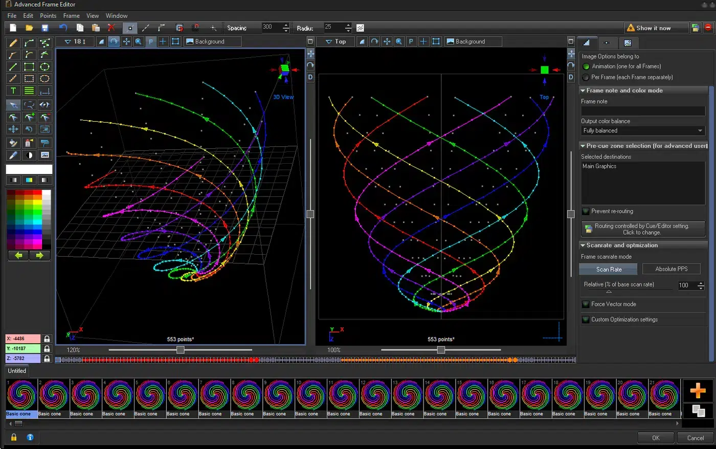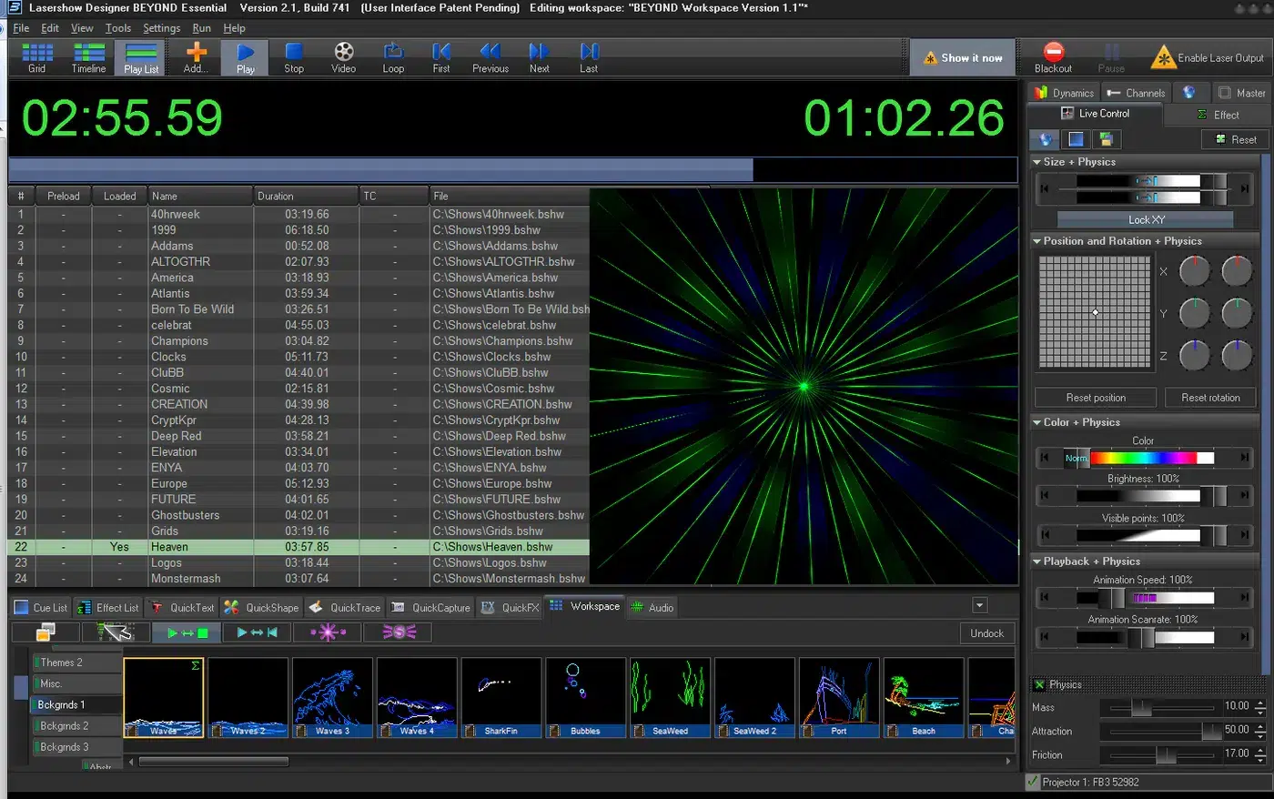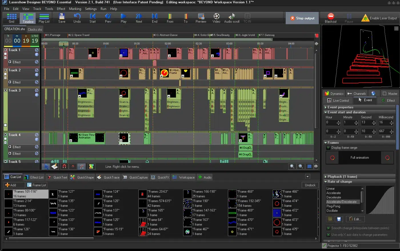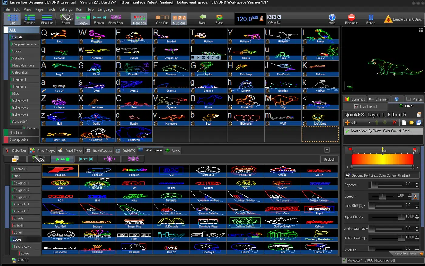 BEYOND es un paquete de software multimedia que te ayuda a integrar láseres en cualquier configuración y combinarlos con otros componentes del espectáculo, como audio, video, pirotecnia y otros efectos especiales.BEYOND te permite diseñar todo tipo de efectos láser: desde efectos de haz aéreo hasta gráficos, texto, logotipos, objetos animados en 3D, secuencias de mapeo láser y más.El software de control láser Pangolin BEYOND está disponible en tres niveles, comenzando con el Esencial.