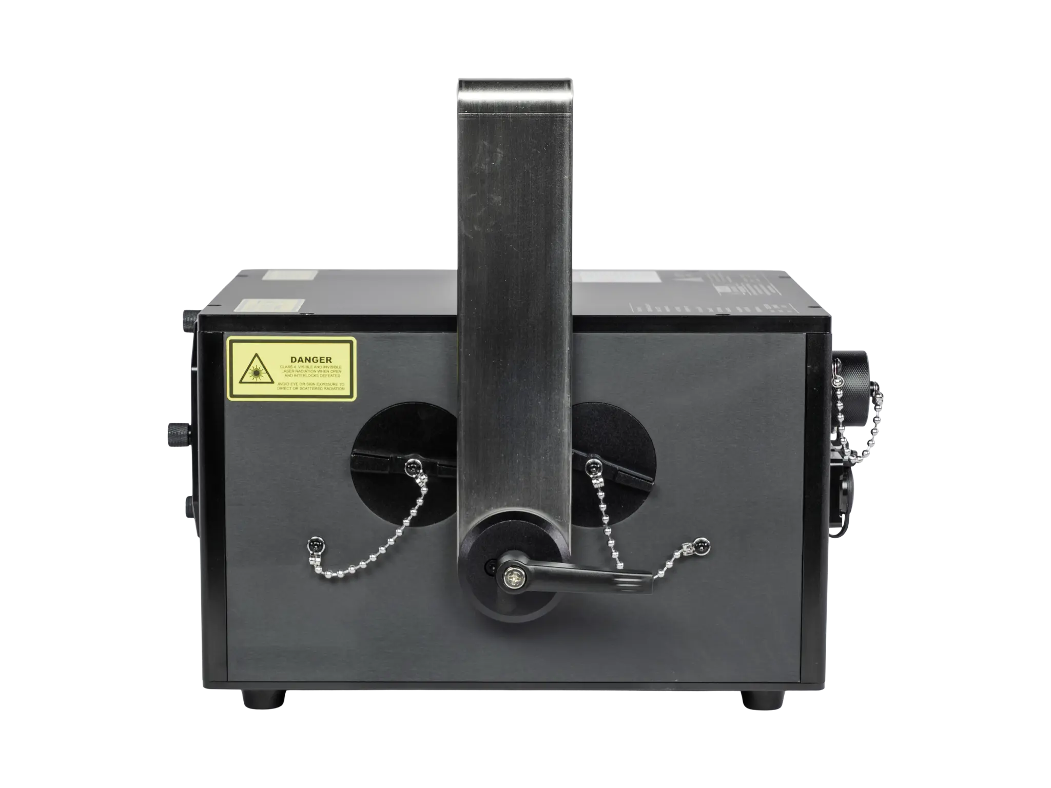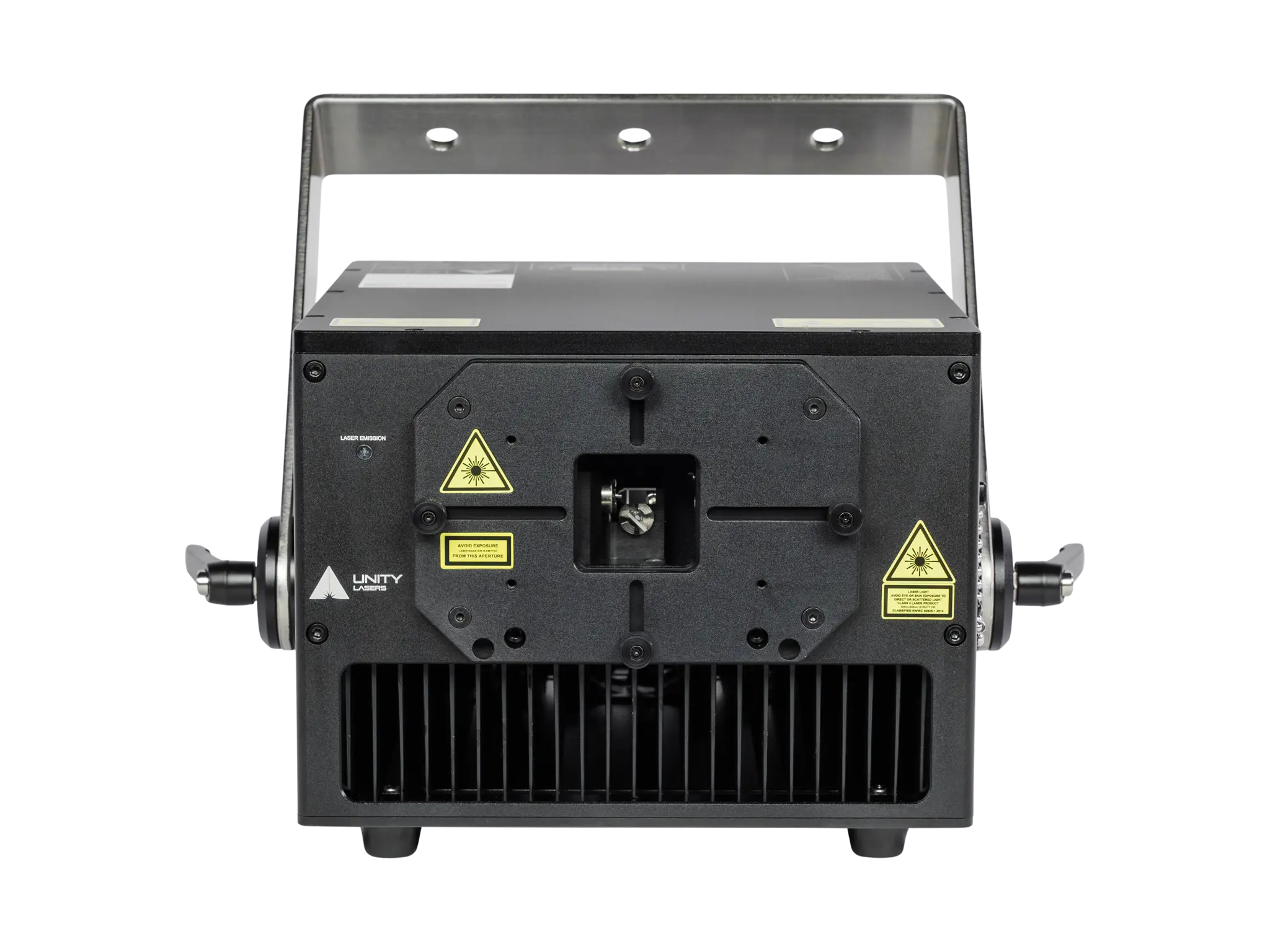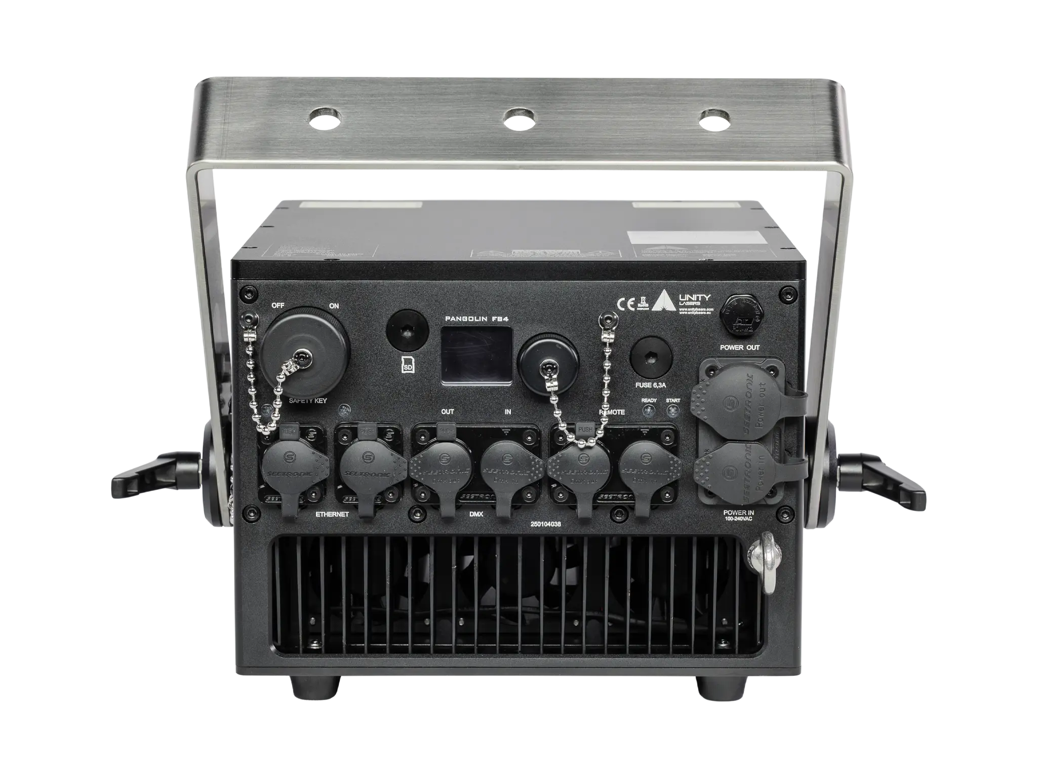 All the adjustments, such as power output of each color, X & Y axes invert, X & Y size and position, safety, etc., are managed digitally by the FB4 control system. Ethernet in/out, power in/out, DMX in/out, Estop in/out