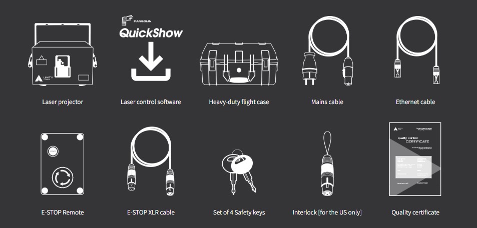 Laser projector w/ FB4 DMX, IP65 housing, protective case, Estop box, Estop cable (10M/30ft), ethernet cable (10M/30ft), power cable (1.5M/4.5ft), interlock (* service dongle if outside US), keys, outdoor RJ45 connectors, manual, quickstart guide, variance card