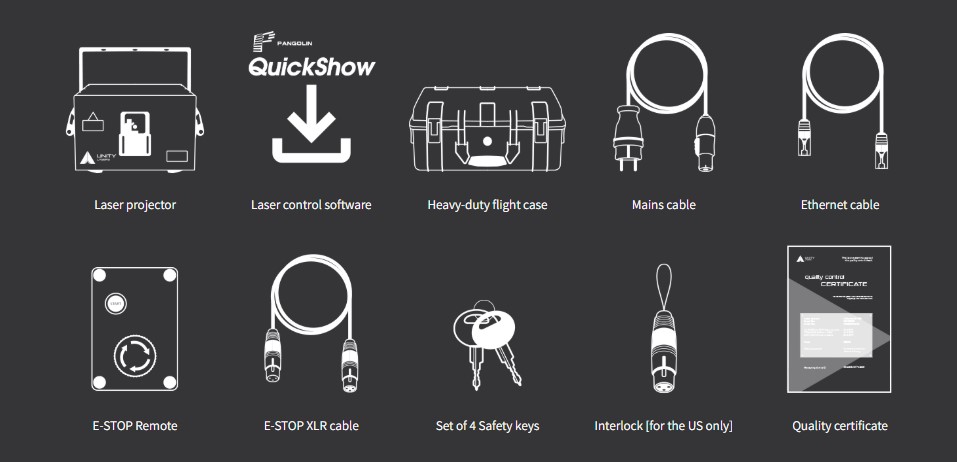 Laser projector w/ FB4 DMX, IP65 housing, protective case, Estop box, Estop cable (10M/30ft), ethernet cable (10M/30ft), power cable (1.5M/4.5ft), interlock (* service dongle if outside US), keys, outdoor RJ45 connectors, manual, quickstart guide, variance card
