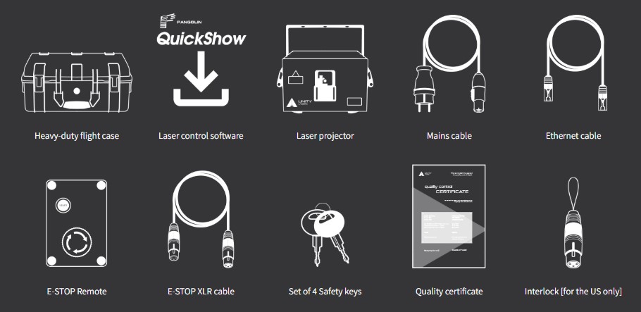 Laser projector w/ FB4 DMX, protective case, Estop box, Estop cable (10M/30ft), ethernet cable (10M/30ft), power cable (1.5M/4.5ft), interlock (* service dongle if outside US), keys, manual, quickstart guide, variance card