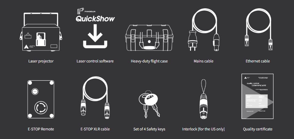 Laser projector w/ FB4 DMX, protective case, Estop box, Estop cable (10M/30ft), ethernet cable (10M/30ft), power cable (1.5M/4.5ft), interlock (* service dongle if outside US), keys, manual, quickstart guide, variance card