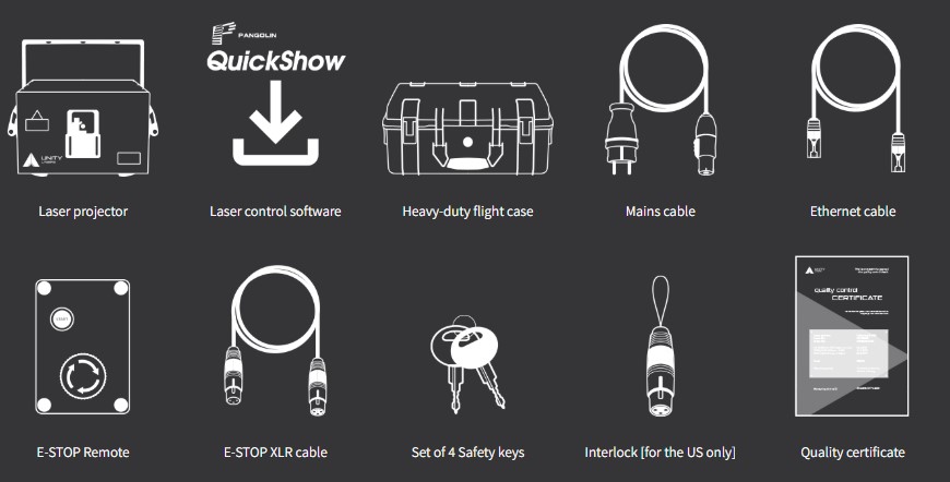 Laser projector w/ FB4 DMX, IP65 housing, protective case, Estop box, Estop cable (10M/30ft), ethernet cable (10M/30ft), power cable (1.5M/4.5ft), interlock (* service dongle if outside US), keys, outdoor RJ45 connectors, manual, quickstart guide, variance card