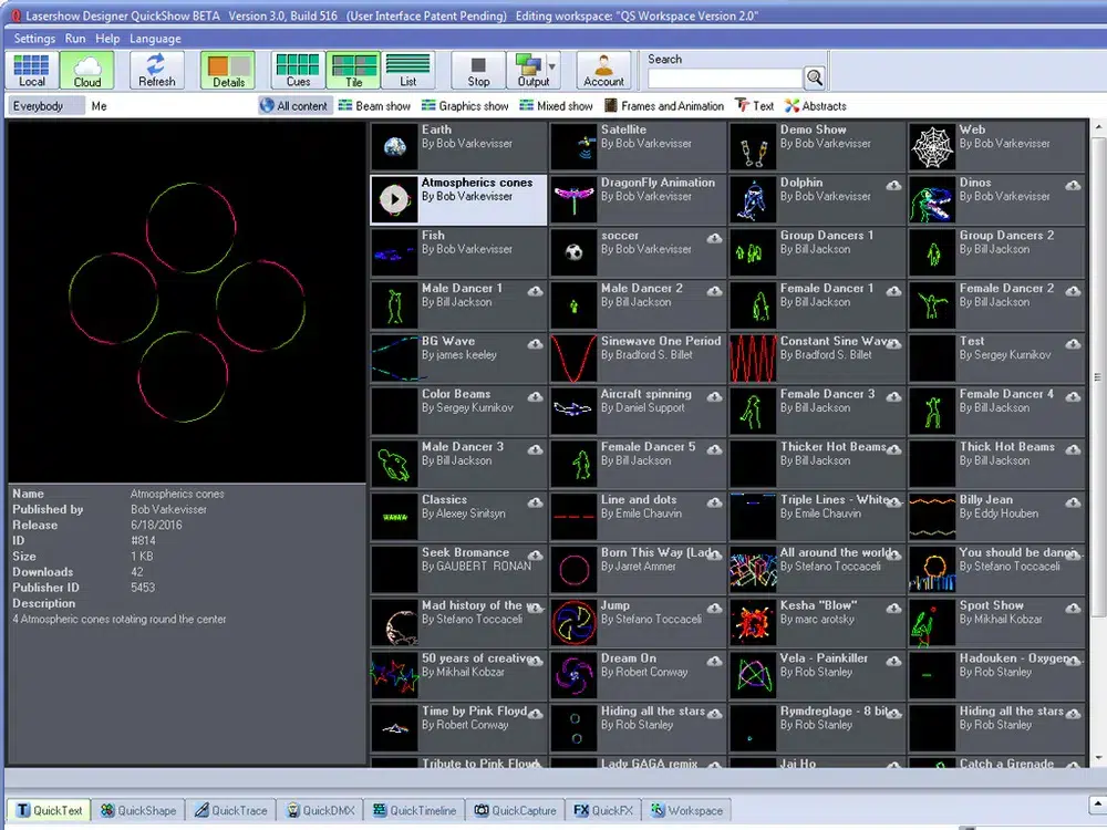 QuickShow es un sistema profesional de control láser que incluye el software QuickShow más reciente y el hardware FB3QS.Tanto si eres nuevo en el mundo del láser como si eres un profesional experimentado, puedes obtener excelentes resultados en cuestión de minutos con QuickShow. El software está repleto de potentes funciones que te permiten crear espectáculos láser, tanto en vivo como preprogramados, de forma más rápida y sencilla que nunca.Las innovadoras Herramientas Rápidas te permiten crear fácilmente efectos de rayo láser personalizados, gráficos, texto, animaciones, resúmenes y logotipos láser.Incluye casi 2000 señales láser preprogramadas y cientos de magníficos espectáculos láser. Si quieres crear impresionantes espectáculos de luz láser sin gastar una fortuna, QuickShow es la solución.Los usuarios de QuickShow también pueden actualizar su software para usar BEYOND.