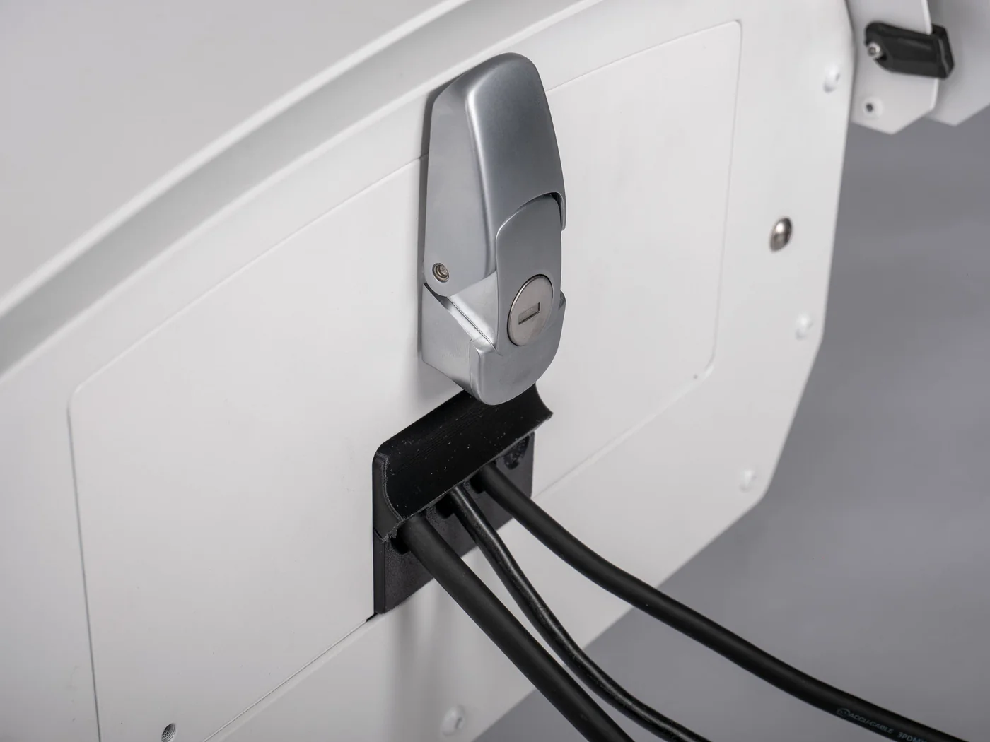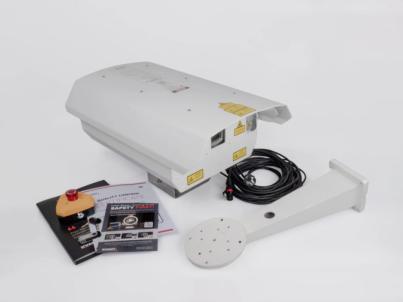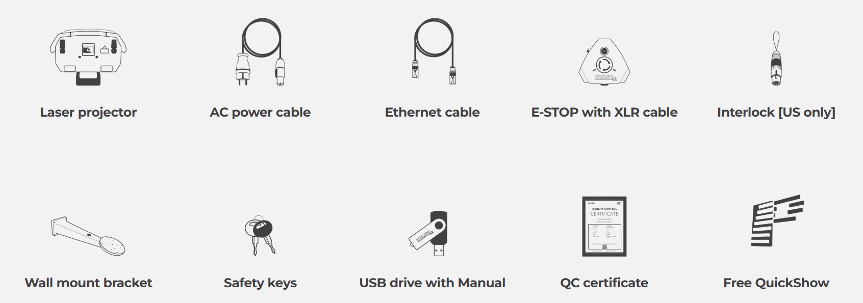 Flat surface bracket and wall mount bracket with fixings, 5M AC power cable, 5M Ethernet rj45 signal cable, E-STOP Remote with 5M 3-pin XLR cable, Set of 2 keys for the lid and 2x E-STOP Remote keys, Interlock bypass dongle [supplied for the USA only], USB memory stick with the user manual, QC certificate.
