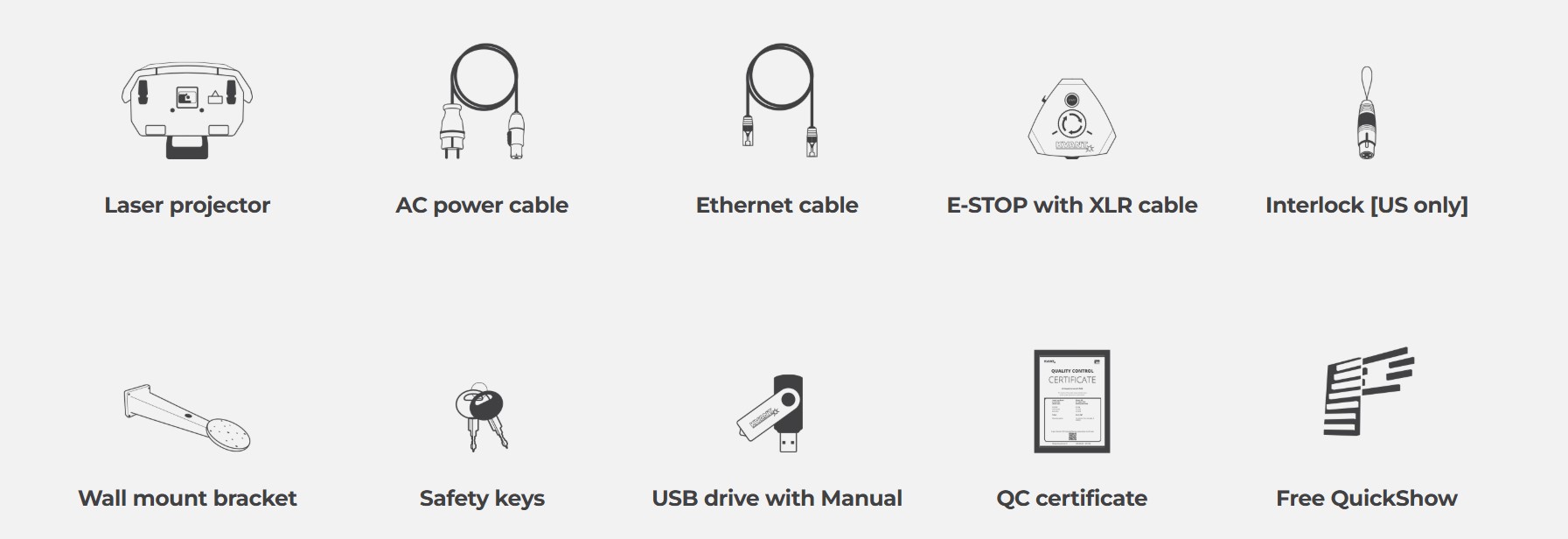 Flat surface bracket and wall mount bracket with fixings, 5M AC power cable, 5M Ethernet rj45 signal cable, E-STOP Remote with 5M 3-pin XLR cable, Set of 2 keys for the lid and 2x E-STOP Remote keys, Interlock bypass dongle [supplied for the USA only], USB memory stick with the user manual, QC certificate.