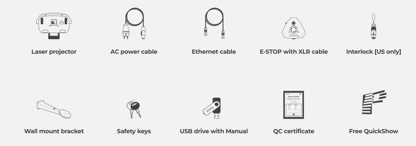 Flat surface bracket and wall mount bracket with fixings, 5M AC power cable, 5M Ethernet rj45 signal cable, E-STOP Remote with 5M 3-pin XLR cable, Set of 2 keys for the lid and 2x E-STOP Remote keys, Interlock bypass dongle [supplied for the USA only], USB memory stick with the user manual, QC certificate.