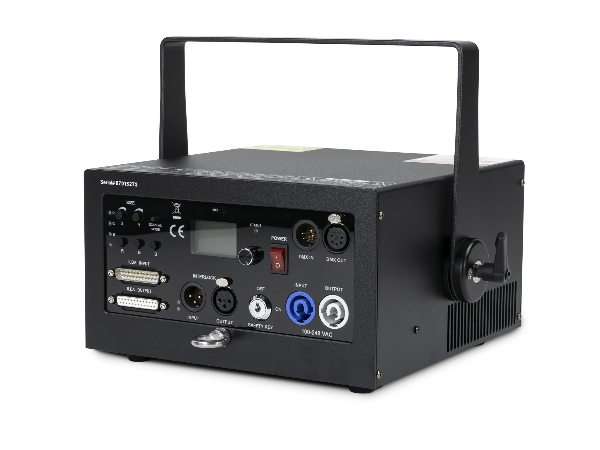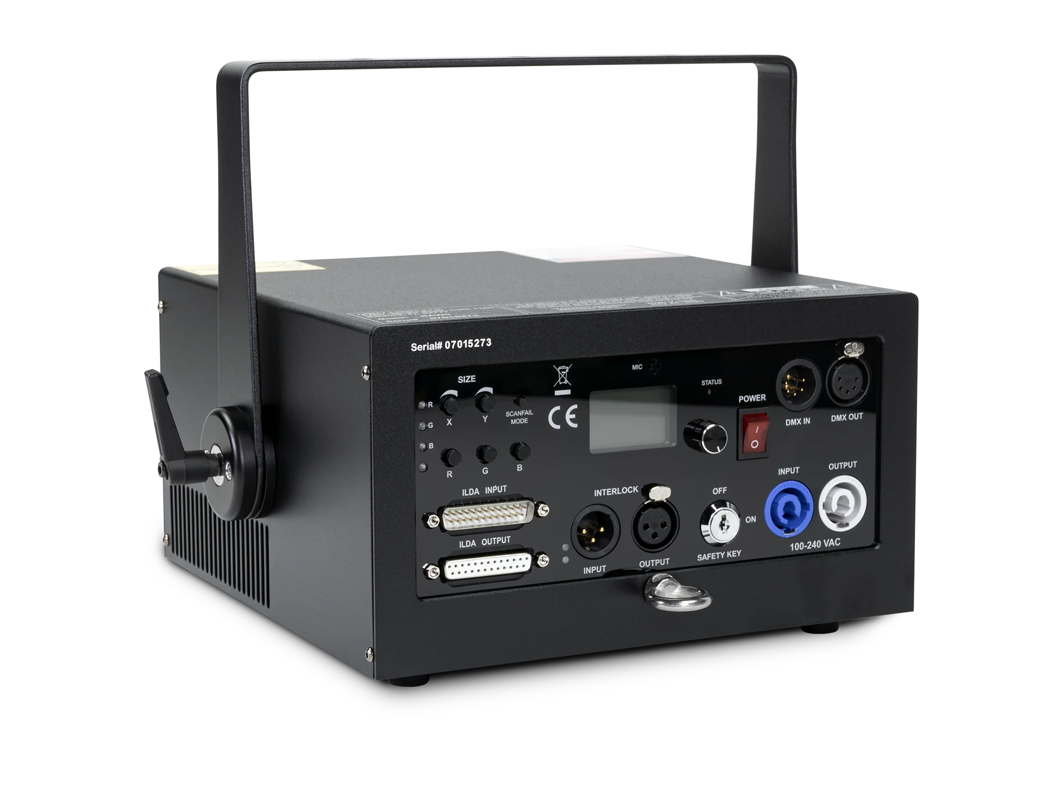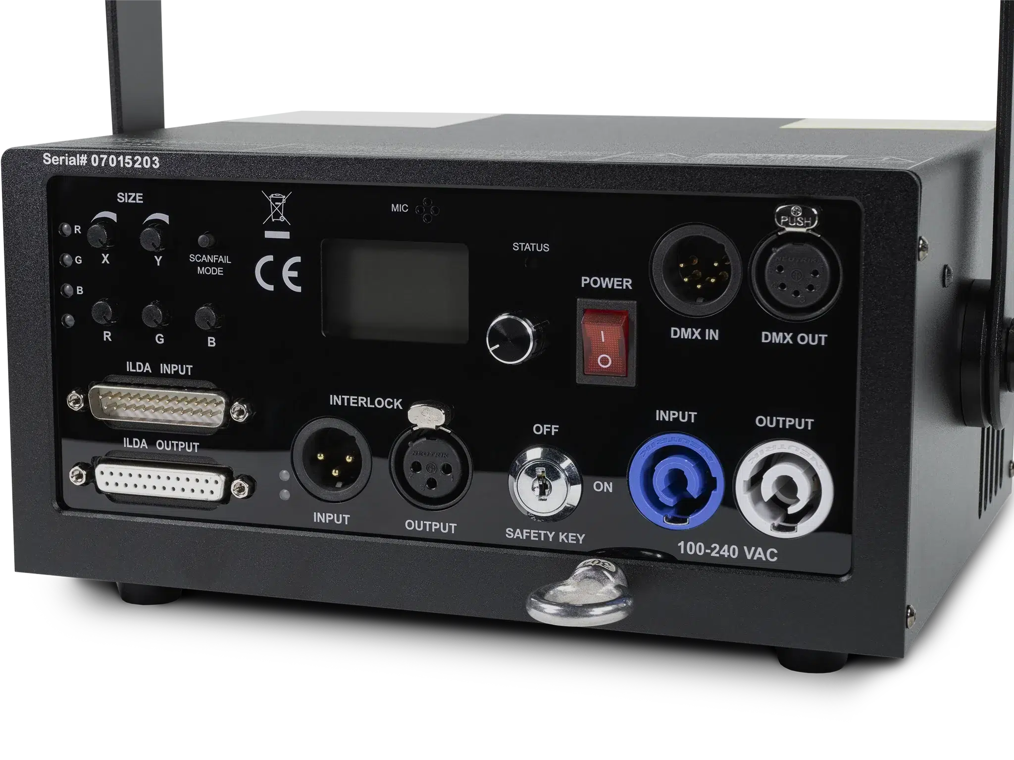Adjustments for color channels (R,G,B), size/position/invert (X,Y), DMX in/out, ILDA in/out, Estop in/out, power in/out, sound active mode, digital display for DMX address and settings