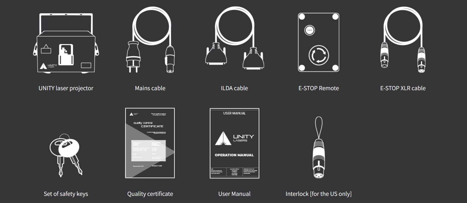 Laser projector, Estop box, Estop cable (10M/30ft), ILDA cable (10M/30ft), power cable (1.5M/4.5ft), interlock (* service dongle if outside US), keys, manual, quickstart guide, variance card, carton packaging